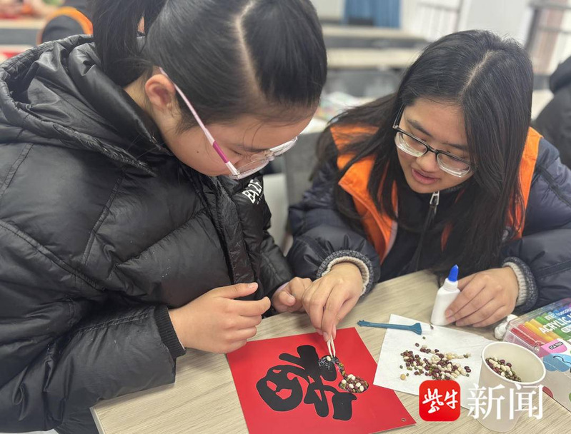 科普环节后,现场迎来了最受欢迎的“五豆纳福”手工制作。红豆、绿豆、黑豆、芸豆等各色种子成了“颜料”“福”字底板则化作“画布”。在大学生志愿者手把手协助下,社区里的老人和孩子共同动手,精心挑选、耐心粘贴。不一会儿,一粒粒朴素的种子渐渐汇聚成一个个饱满而独特的“福”字,传递着五谷丰登、福气盈门的新春寓意。